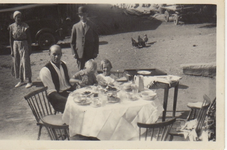 Axel Johansson (1895-1974) och sonen Bengt (1930-2016) sitter och fikar vid matbordet i trädgården, Labacka 1:2 "Lund" okänt årtal. Övriga personer är troligtvis sommargäster. I bakgrunden pickar några höns på marken.