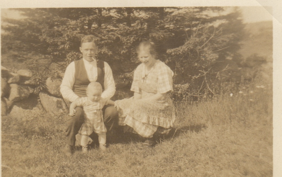 Familjen Erik Lindegren och Märta* (född Olsson) med sonen Sven Erik sitter i trädgården, Labacka 1:2 "Lund 1930-tal.