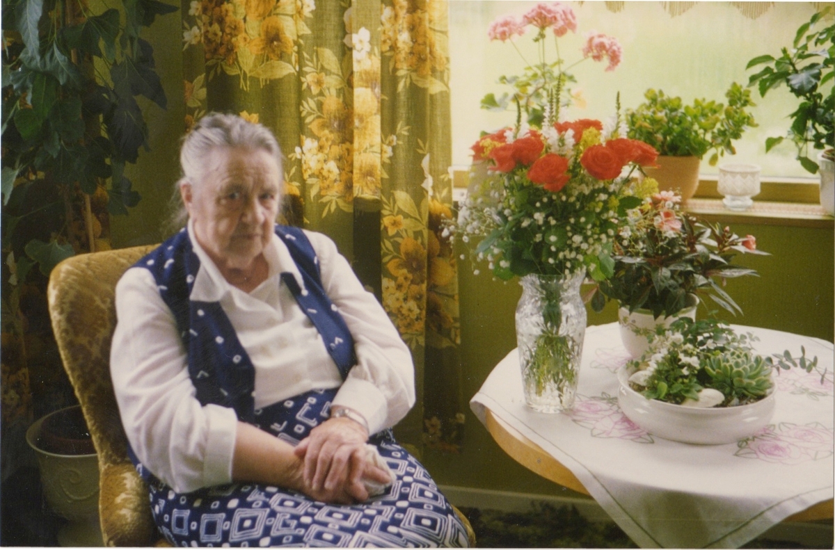 Uppvaktning för 95-åriga Lisa (Elise) Johansson som sitter i sin bostad Labacka 1:2 "Lund" 1993. Född 1898 i Torp (Uddevalla), död 1997 i Kållered.
