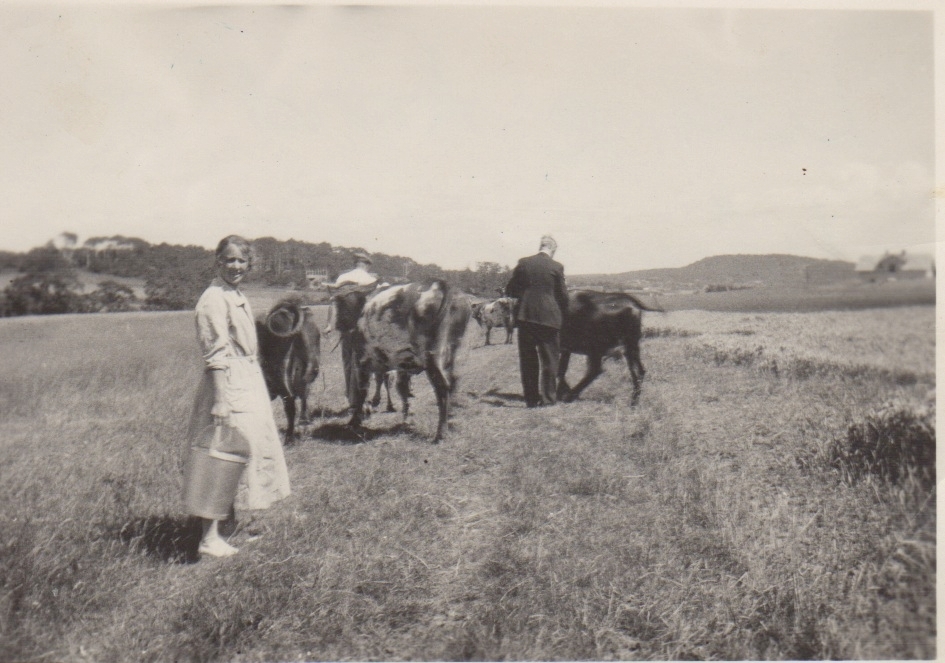 Mjölkning vid Labacka 1:2 "Lund" cirka 1930. "Lisa" Johansson står närmast med en spann i handen. I bakgrunden till vänster ses maken Axel Johansson.