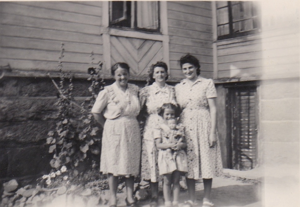 Tre kvinnor och ett barn står utanför bostadshuset Labacka 1:2 "Lund" cirka 1930. Till vänster står "Lisa" Johansson (1898-1997). Övriga är sommargäster.