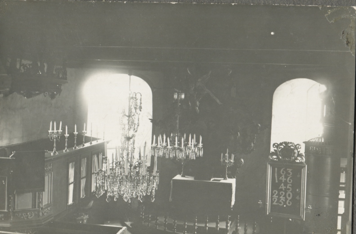 Interiör i Kållereds kyrka före 1930. Bakre kristallkronan är skänkt av Oscar Smitt. Nu (2022) hänger den i Samariterhemmet i Uppsala.