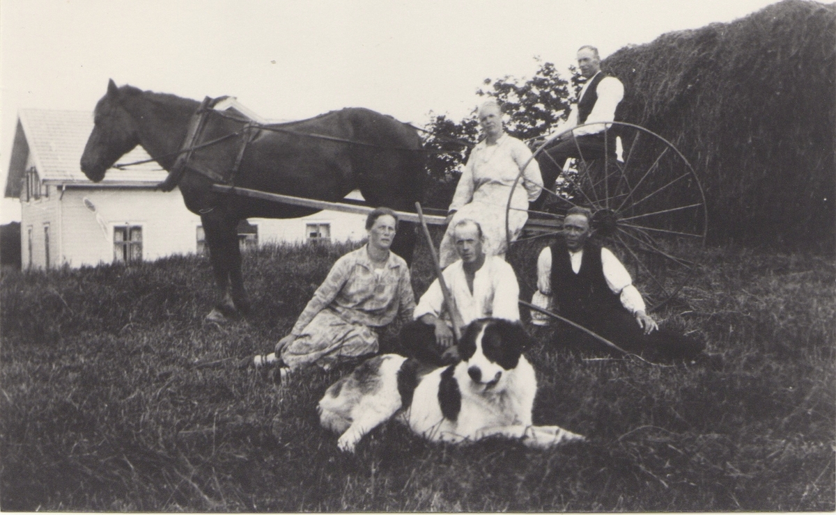 En häst med fastspänd "räfsa" och en grupp människor, Labacka 1:2 "Lund" 1930-tal. Selma (1874-1950) och Adolf Johansson (1868-1935) sitter på "räfsan". Framför dem från vänster: 1. Okänd kvinna. 2. Axel Johansson (parets son, 1895-1974). 3. Okänd man. Framför Axel ligger en stor hund. I bakgrunden ses familjens gård.