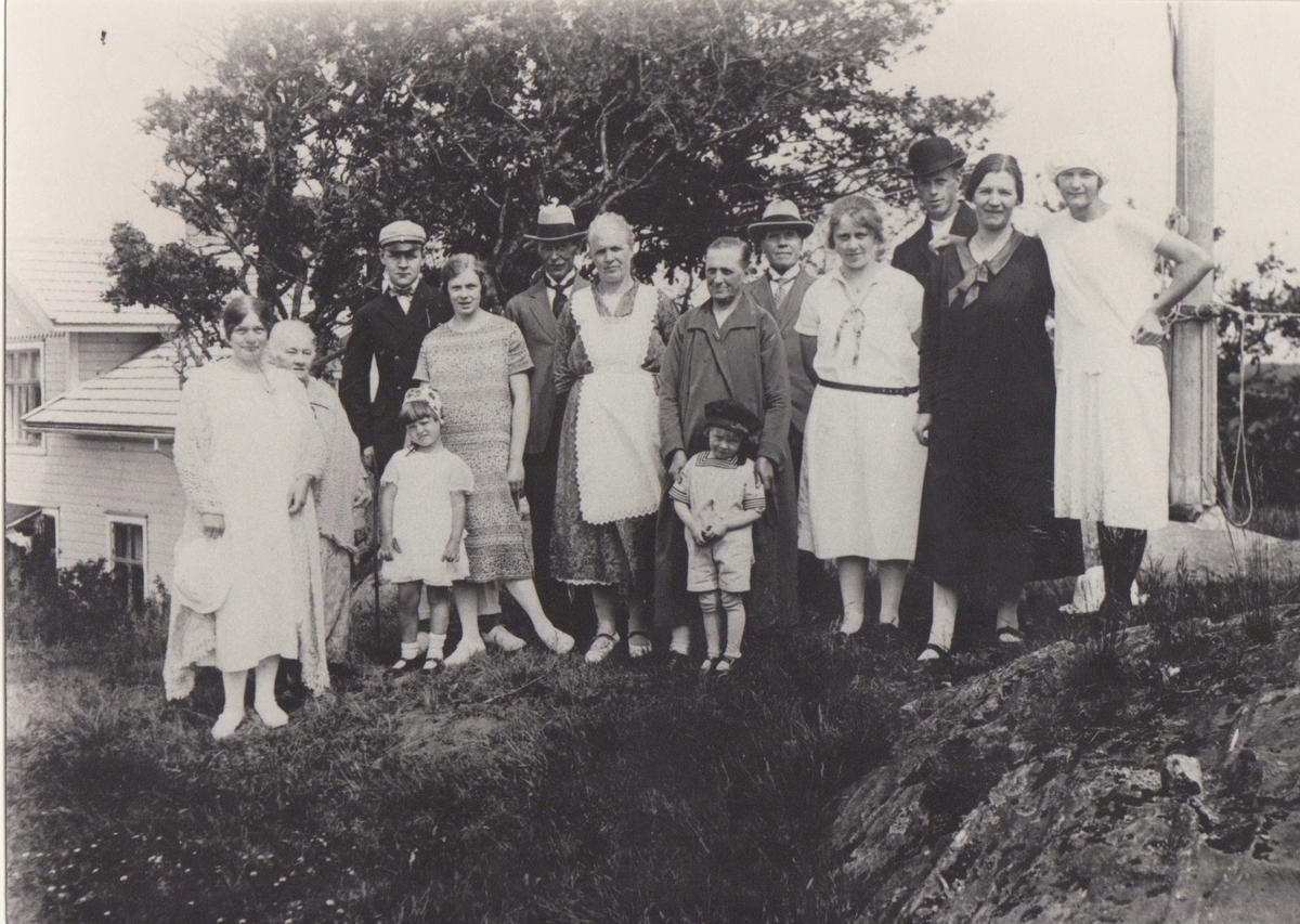 Boende och sommargäster poserar vid Labacka 1:2 "Lund" cirka 1930.