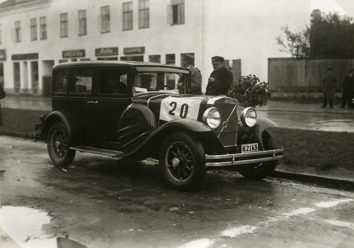 Biltävling i Kalmar i början av 1930-talet. Start vid Esplanaden utanför Amerikanska Motorimporten. Kalmar Bil & Traktoraffär. Mannen med klockan är sedermera bilinspektör Folke B Sundberg.