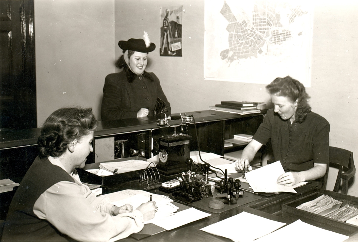 Fru Marianne Gustafsson vid disken på Kristidsnämnden i Kalmar någon gång under andra världskriget.