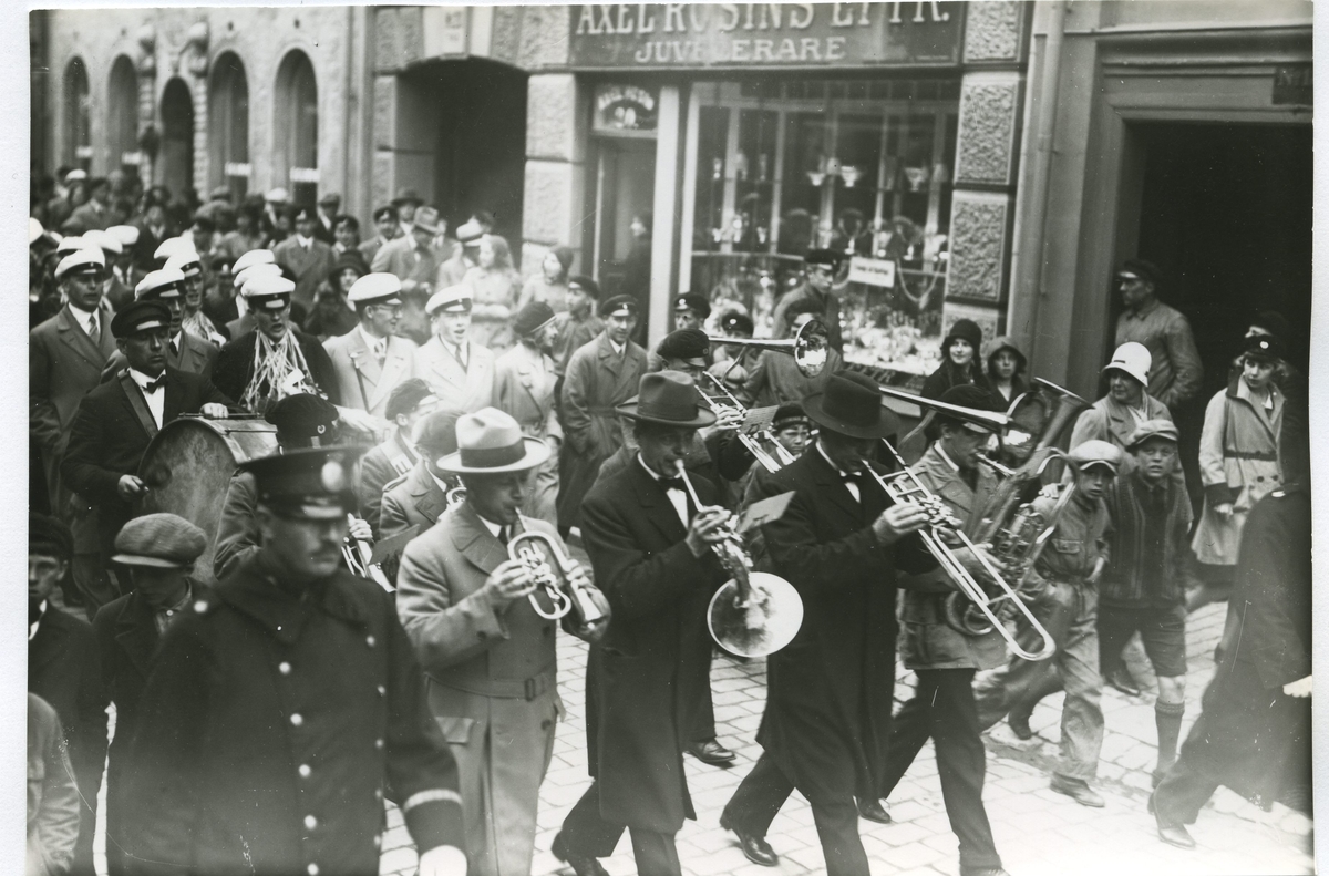 Polisen är överkonstapel Josef Karlsson. Närmast i musikkåren är typograf Petterson "Barometern" Tredje fr.v. skräddaren Jonas Öberg. Närmast honom läroverkselev Weman.