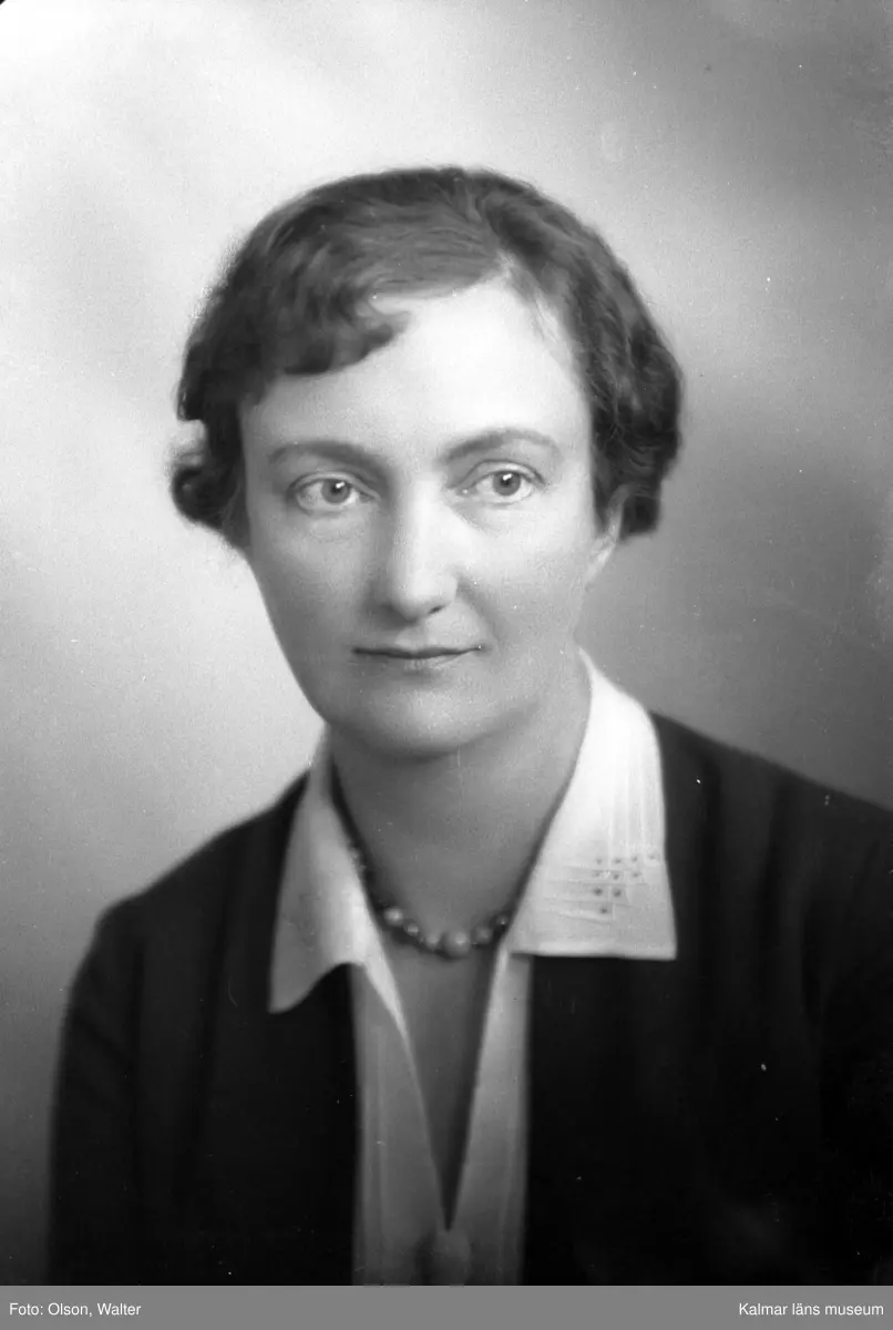 Ateljébild på en kvinna i blus, jacka och pärlhalsband. Beställare till bilden: Fru Olga Qvarnström ifrån Mörbylånga.