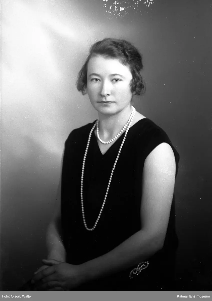 Ateljébild på en kvinna i brosch och klänning. Beställare till bilden: Fröken Ester Karlsson ifrån Gelebo i Nickebo.