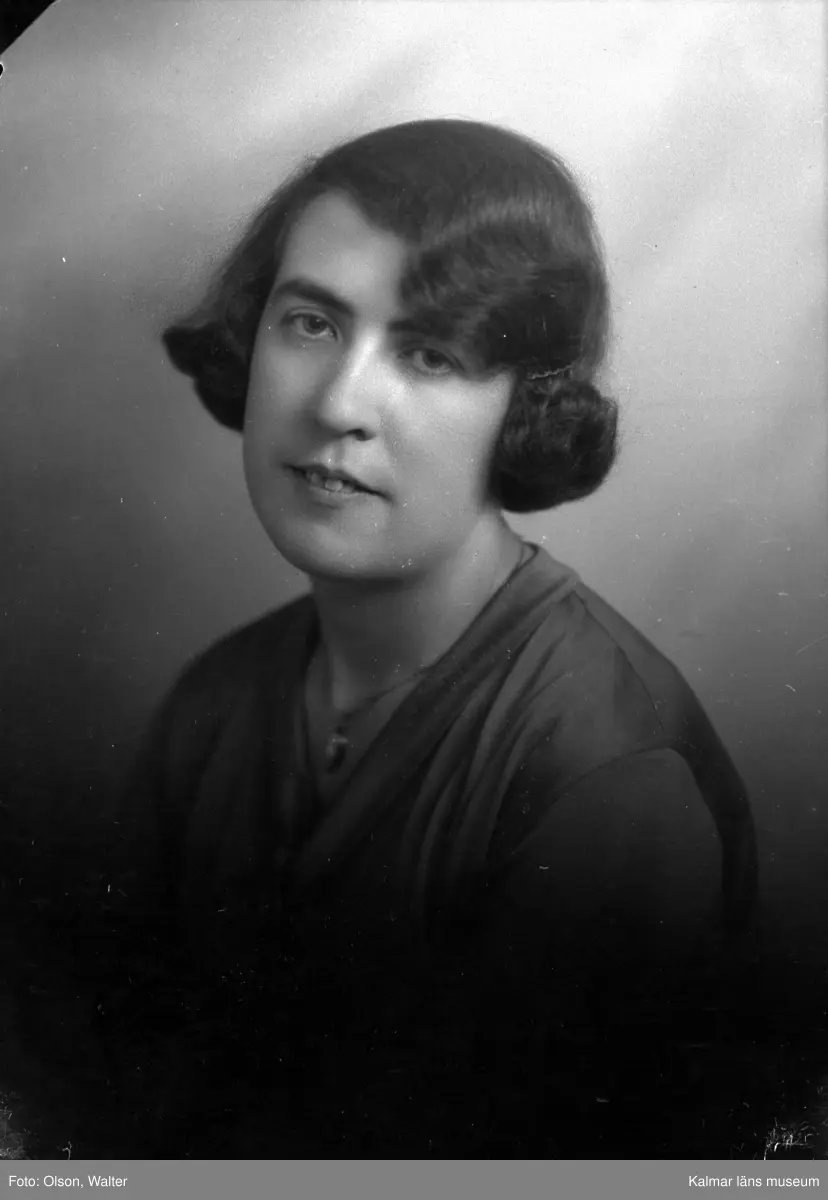 Ateljébild på en kvinna med en medaljong. Beställare till bilden: Fröken Linnéa Jönsson ifrån Ölands Gräsgård.