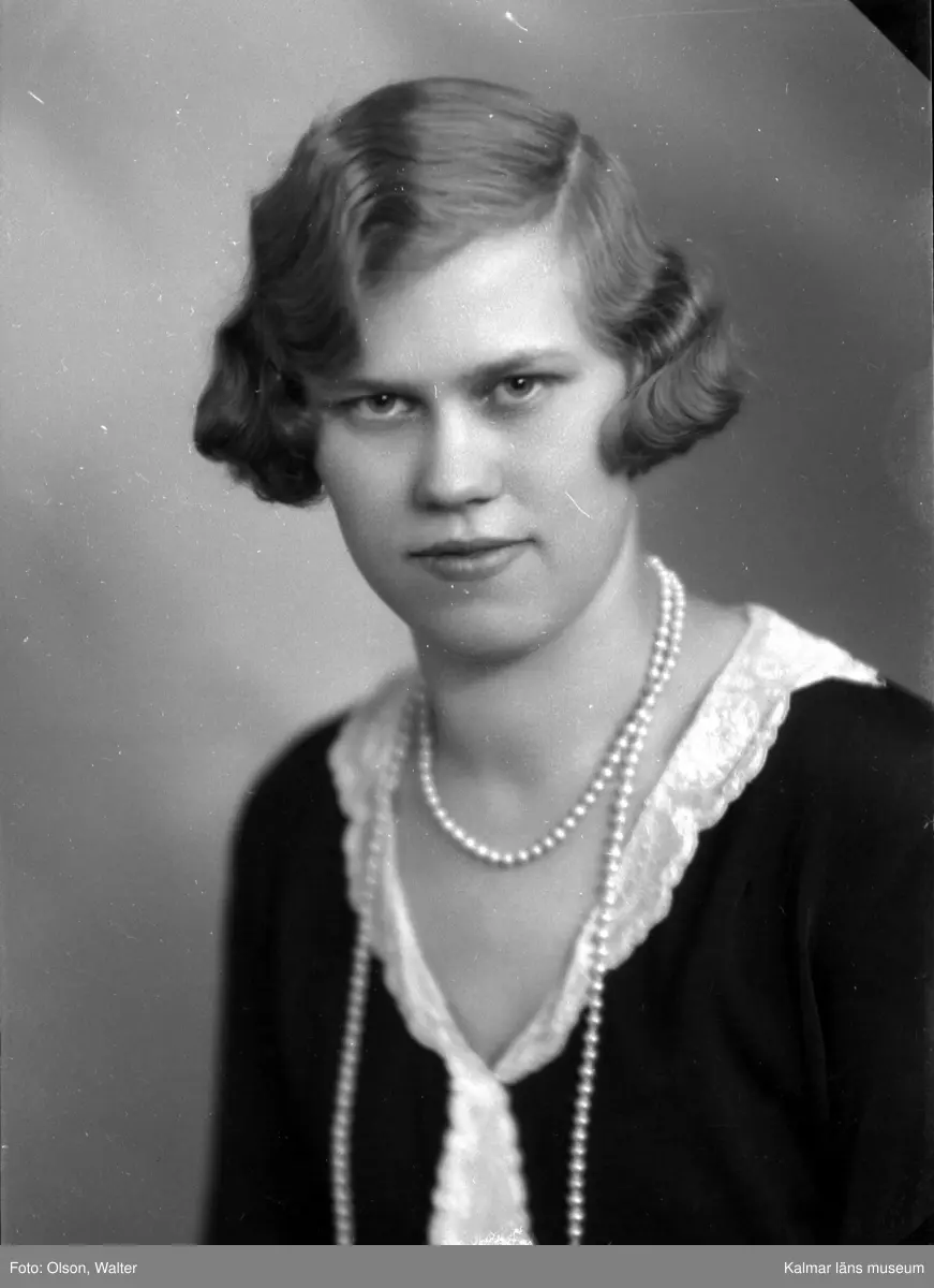 Ateljébild på en kvinna med halsband och spetskrage. Beställare till bilden: Ella Karlsson ifrån Lindsdal i Förlösa.