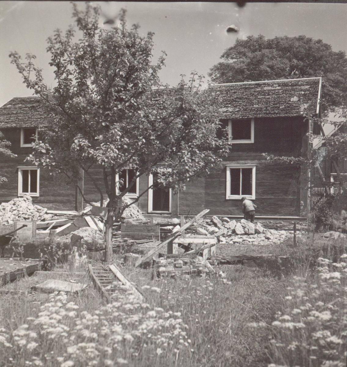 Björkerum 5. Manbyggningen, bakväggen. Till höger om högra fönstret hällkista. Manbyggningen uppförd omkring 1840.