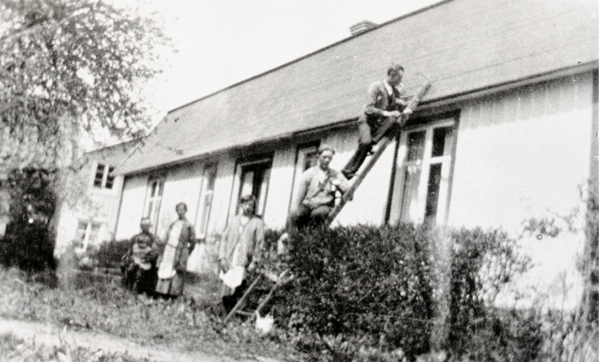 Personer från vänster Einar Eriksson med dottern Ingrid i knäet hustrun Betty, okänd och på stegen nederst John Johansson överst Ragnar Larsson.