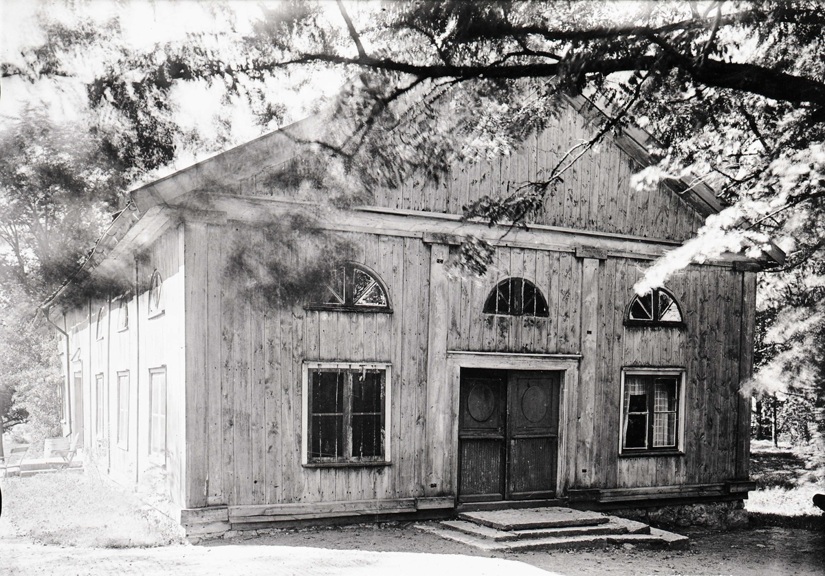 Flygelbyggnad av trä med slätpanel vid slottet i Gränsö.