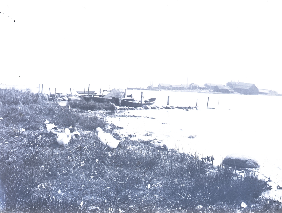 Vy med båtar, vågbrytare av stenar och Varvsholmen i bakgrund. Utsikt från Ängö mot Varvsholmen.