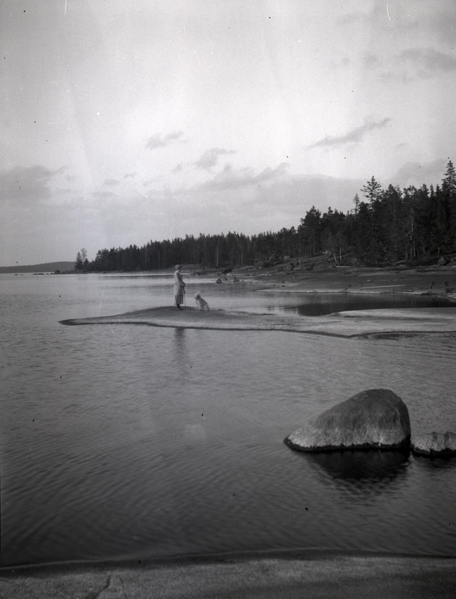 En dam med en hund vid sjön Möckeln i närheten av Tuna gård.