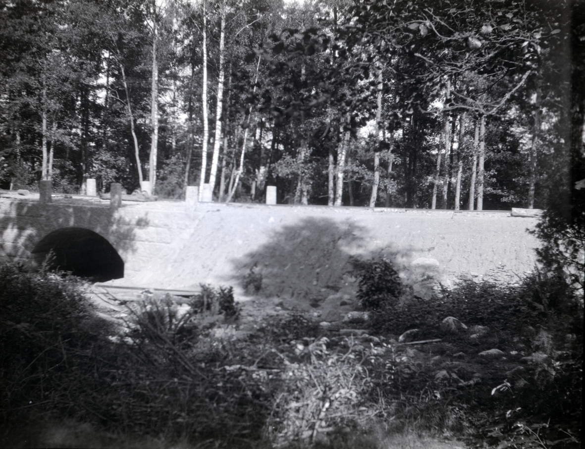 Bild på en nyanläggning av väg och bro. Den är byggd av huggen sten i kallmur. Räcken har inte än kommit på plats. Bron är över Tunaåns utlopp i Tunasjön. Byggd av huggen sten 1932 av AB Vägförbättringar.