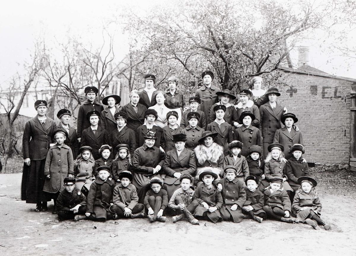 I mitten damer med hattar, från vänster fru Johansson och fru Ekman. Till höger om de vuxna !.a Dagny Lind, 3:e barberare Ohlssons flicka. Foto: oktober 1916.