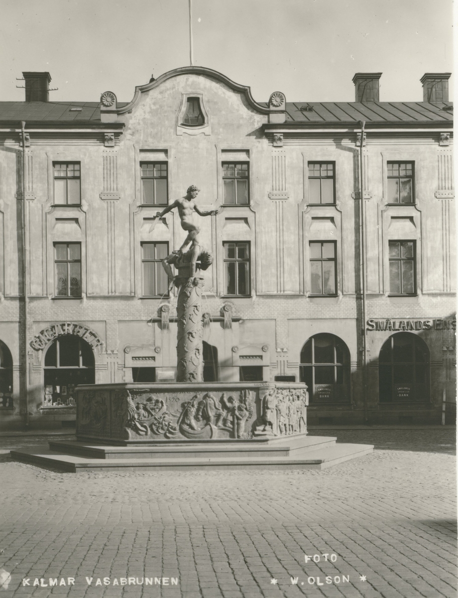 Kalmar, Kvarnholmen, Larmtorget. Vasa-Brunnen, "Eoska huset".