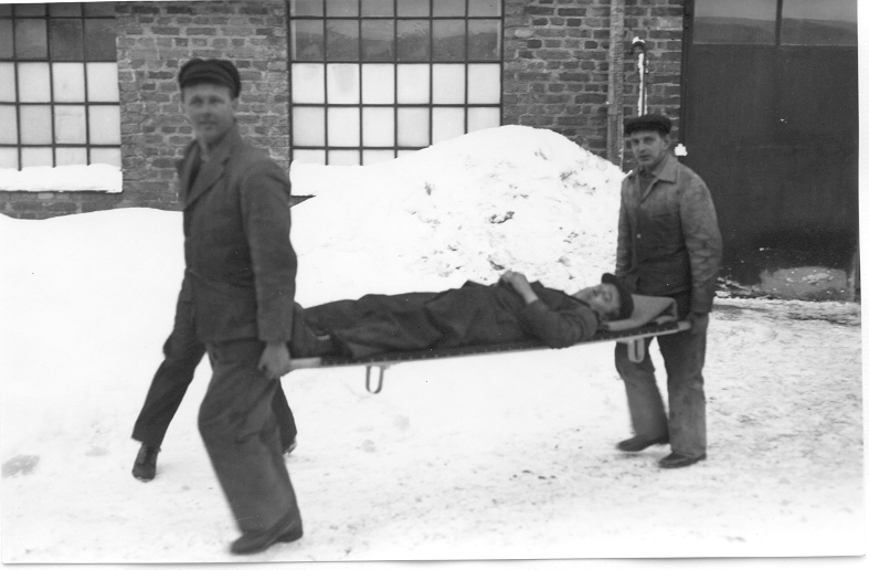 Civilförsvarsövning. På båren elförman Gustafsson. Arenco 1939-1940.