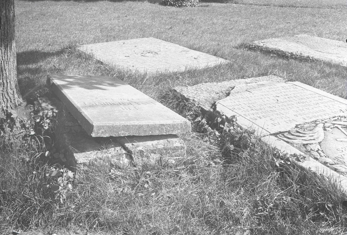 Till vänster häll över Anna Palmquist (1796-1855). Till höger skepparen Gudmund Bergström 1785. I mitten bakom dessa en slät häll med dödskalle i mitten samt: H L B G. OF. V.A.S. E S D. 41. Anno 1628.