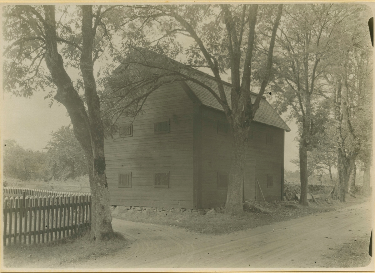 Magasin vid vägskälet strax norr om mansgården. (Planen n:r 13). Timmer, avsågade knutar. Rött med lister, knutpanel och luckor i svart.