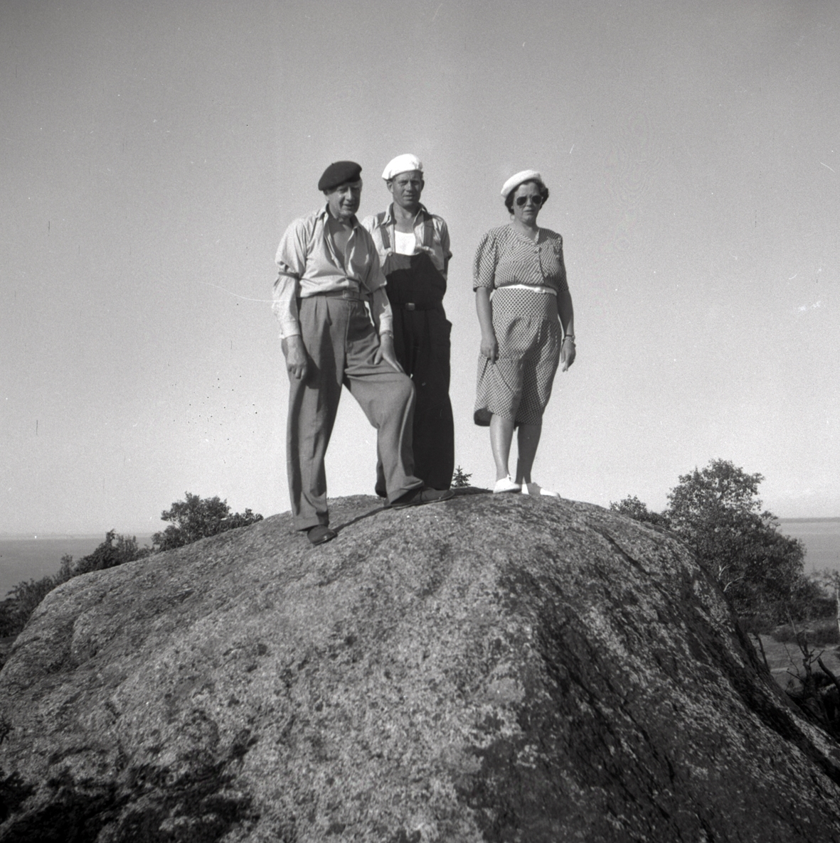 Vy från Blå Jungfrun. Två män och en kvinna på en klipphäll.