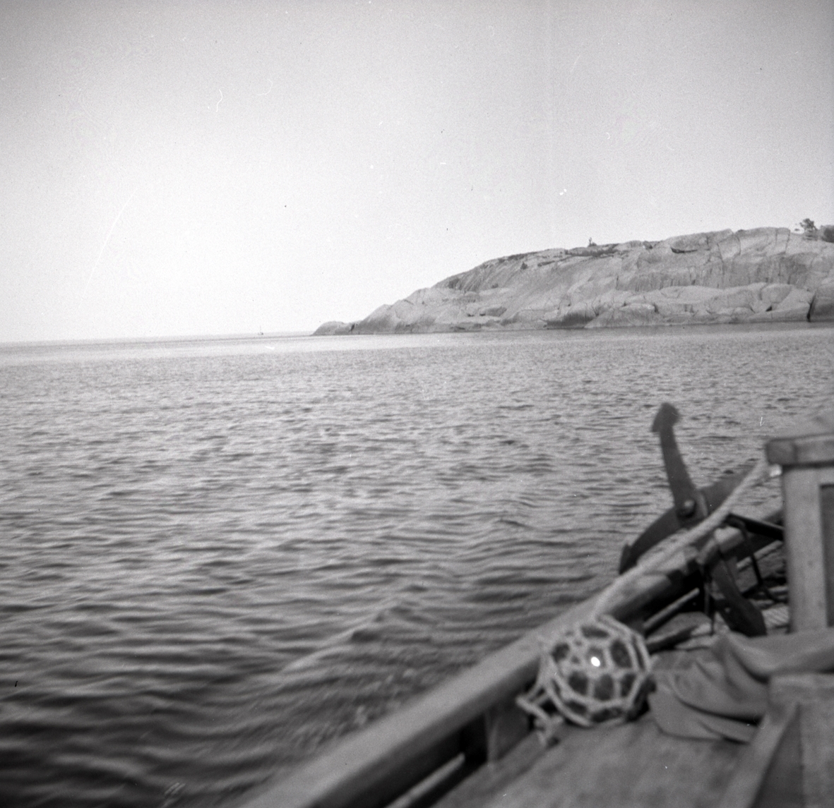 Vy från Blå Jungfrun. Klipphäll och en båt.