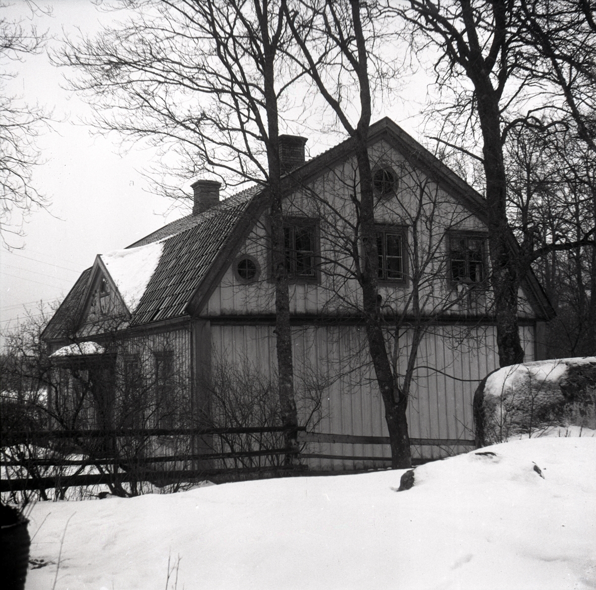 Mangårdsbyggnad i Runtorp, med mansardtak, träpanel och Tympanon.