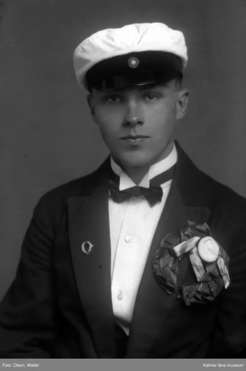 Ateljébild på en man som har tagit studenten, med studentkrans, studentmössa och studentnål. Enligt Walter Olsons journal är bilden beställd av Sigurd Rydén.