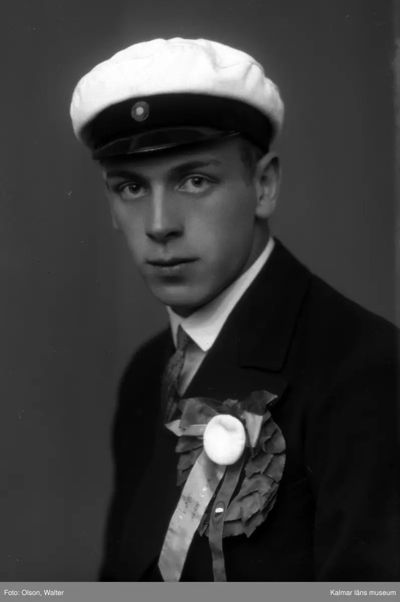 Ateljébild på en man som har tagit studenten. Han har en studentkrans och studentmössa på sig. Enligt Walter Olsons journal är bilden beställd av Arvid Ekeroth.