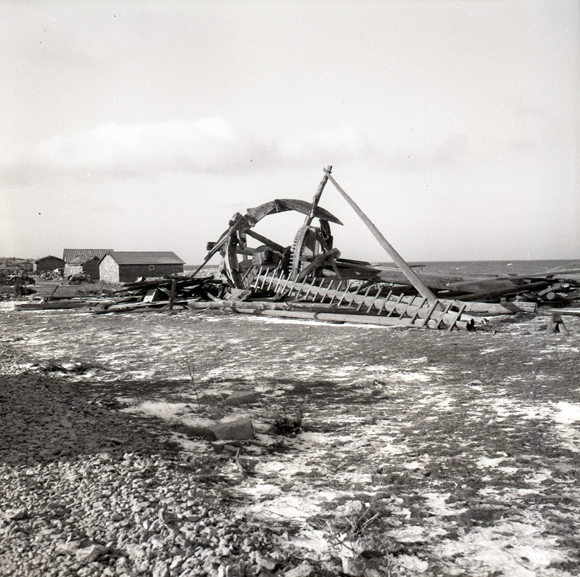 Skurkvarn vid Hjorthamn omkullblåst den 21/2 1962. Skurkvarnar användes för att med vindens hjälp slipa kalksten.