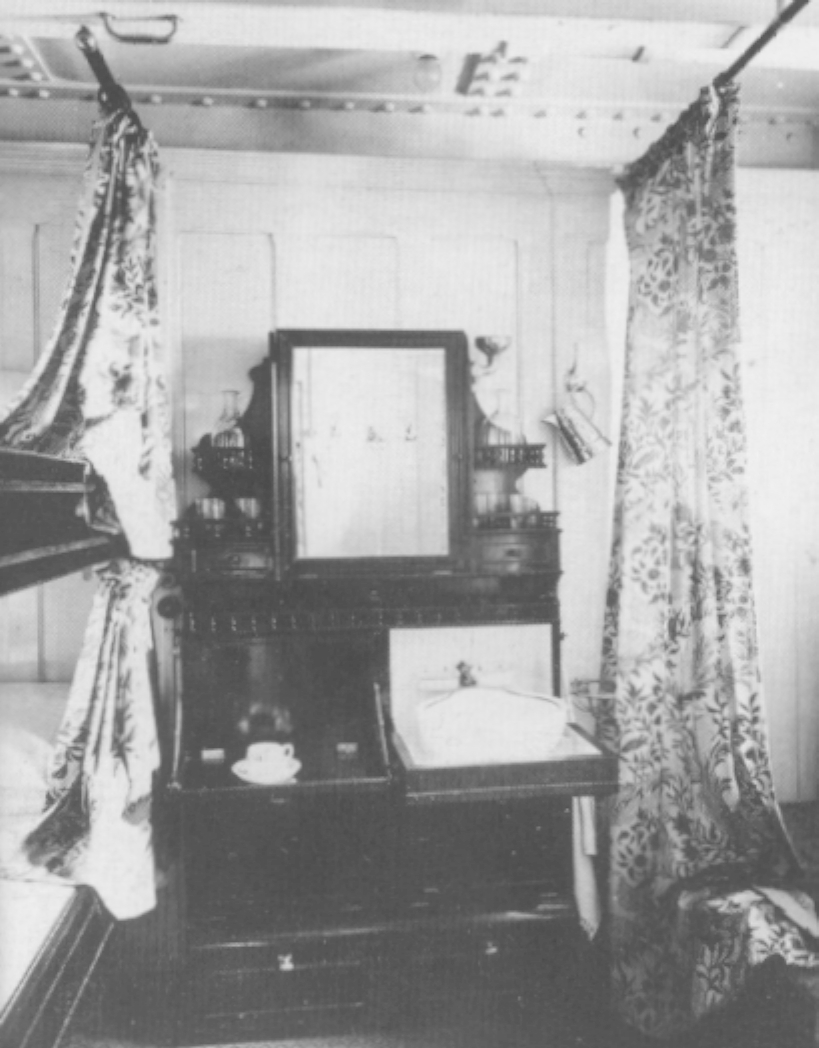 Tvåmanshytt med toalettmöbel och blommiga förhängen.