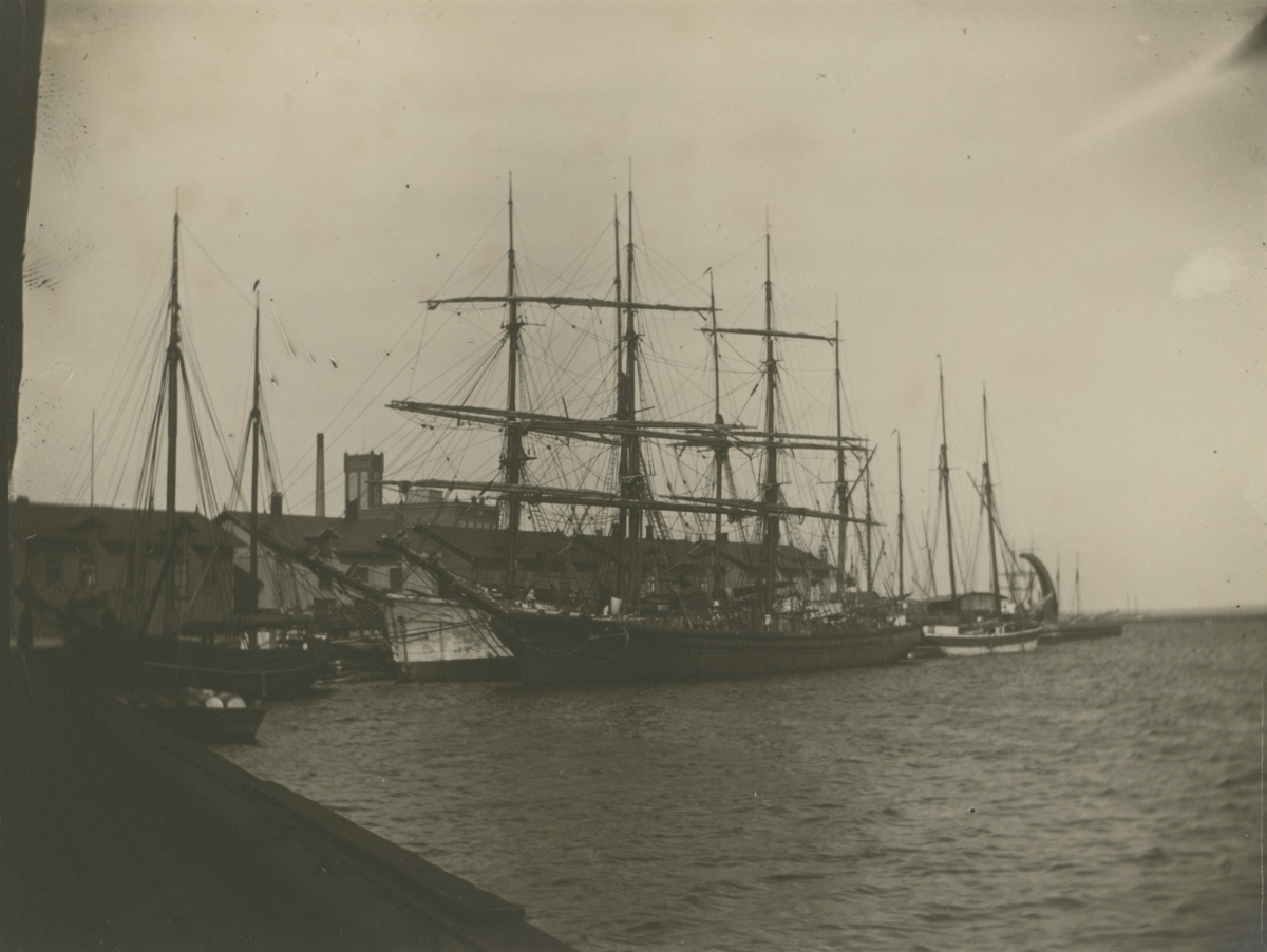 Fullriggare vid hamnen i Kalmar. Ångkvarnen i bakgrunden.