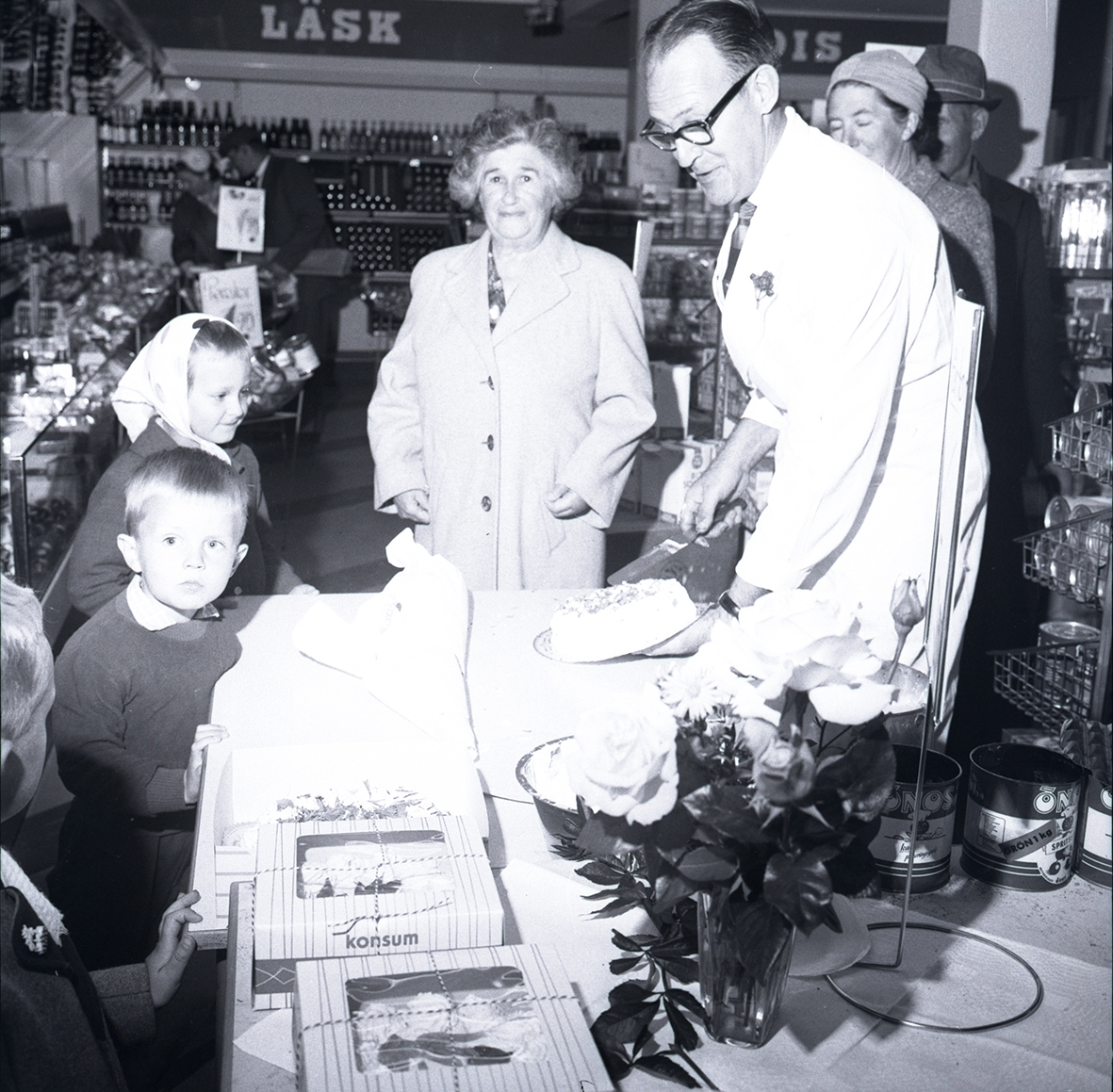 Konsumbagaren i Borgholm. Kunder i butik bjuds på tårta.