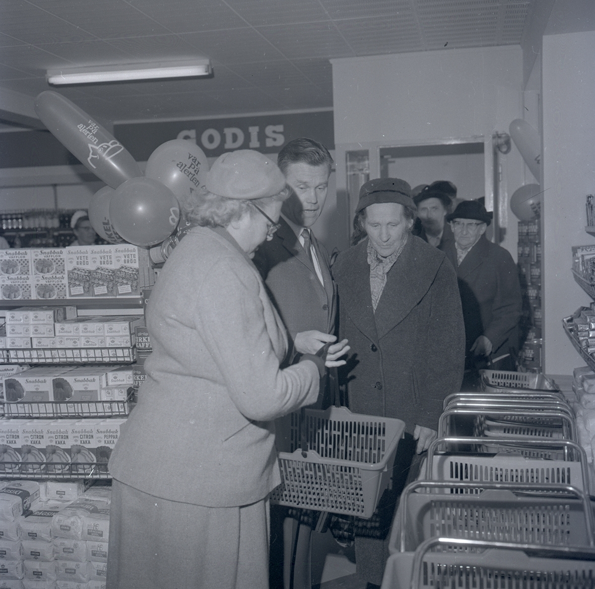 Bild tagen i samband med invigning av Konsum. Folk som står i kö och en kvinna som håller i en kundkorg. Troligen håller butiksföreståndaren på att visa hur man handlar i det nya snabbköpet där man själv får plocka ihop varorna.