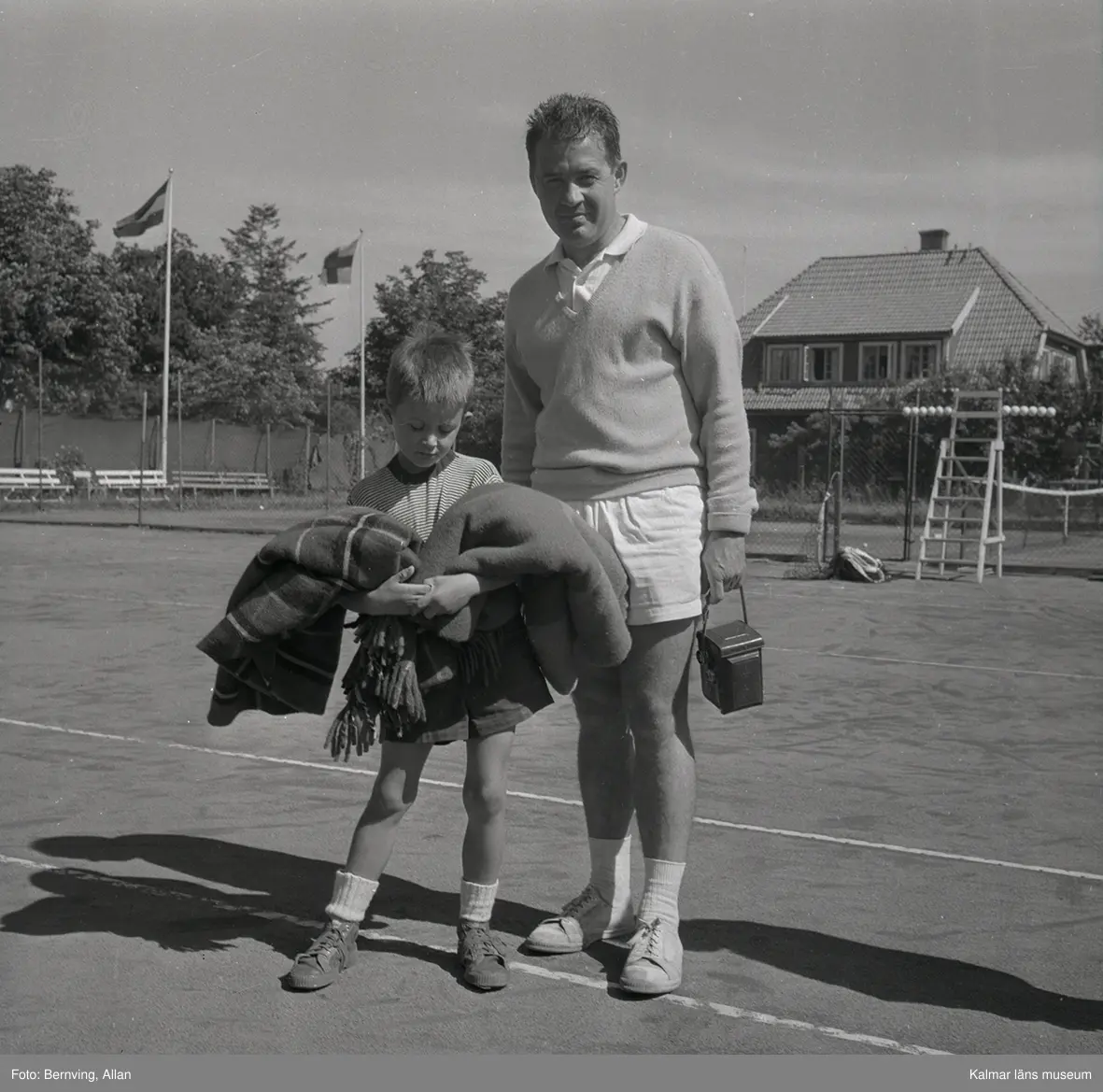 Tennisfinaler och prisutdelning en måndag. En pojke med två filtar och en man. Namn medföljande bild: Mjörne.