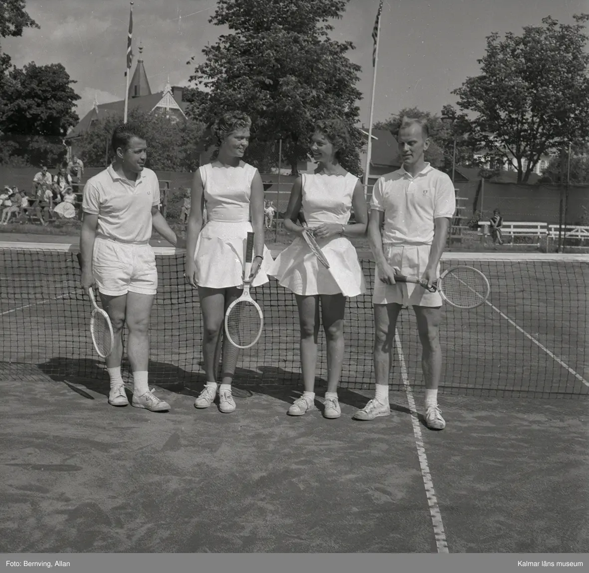 Tennisfinaler och prisutdelning en måndag. Fyra tennisspelare vid nätet. Namn medföljande bild: Mjörne.