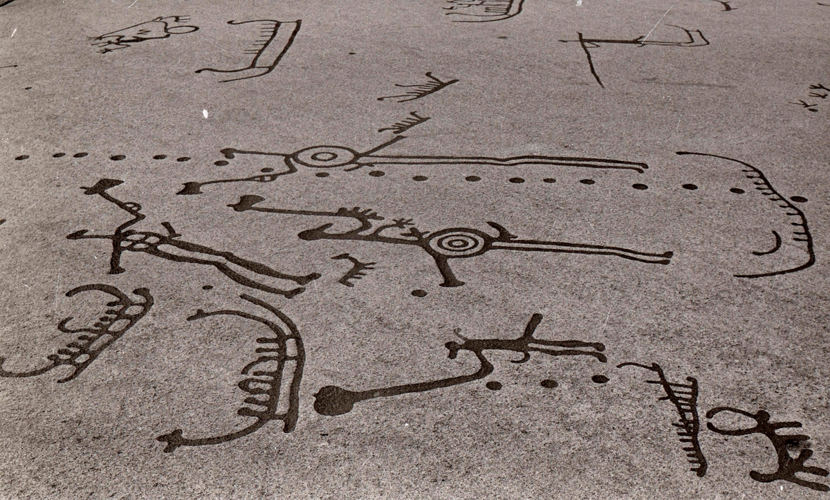 Hällristningar. Hällristningsområdet i Tanum är ett område i Tanums kommun i Bohuslän där man funnit flera berghällar med stora mängder hällristningar från bronsåldern. Runt den största av dem, Vitlyckehällen, är Vitlycke museum uppbyggt. Hällen har närmare 300 inhuggna figurer och ca 170 skålgropar. Den kanske mest berömda scenen bland alla Tanums hällristningar, "Brudparet", finns här. Bland de övriga närliggande hällarna märks Litsleby med en ca 2,3 meter lång spjutbeväpnad man, "Spjutguden", och Aspeberget med en plöjningsscen, ett antal oxar och skepp. Hällen vid Fossum ligger en bit från de övriga. Den kännetecknas av en mer sammanhållen och konstnärlig komposition. Kanske är den gjord av en enda ristare.