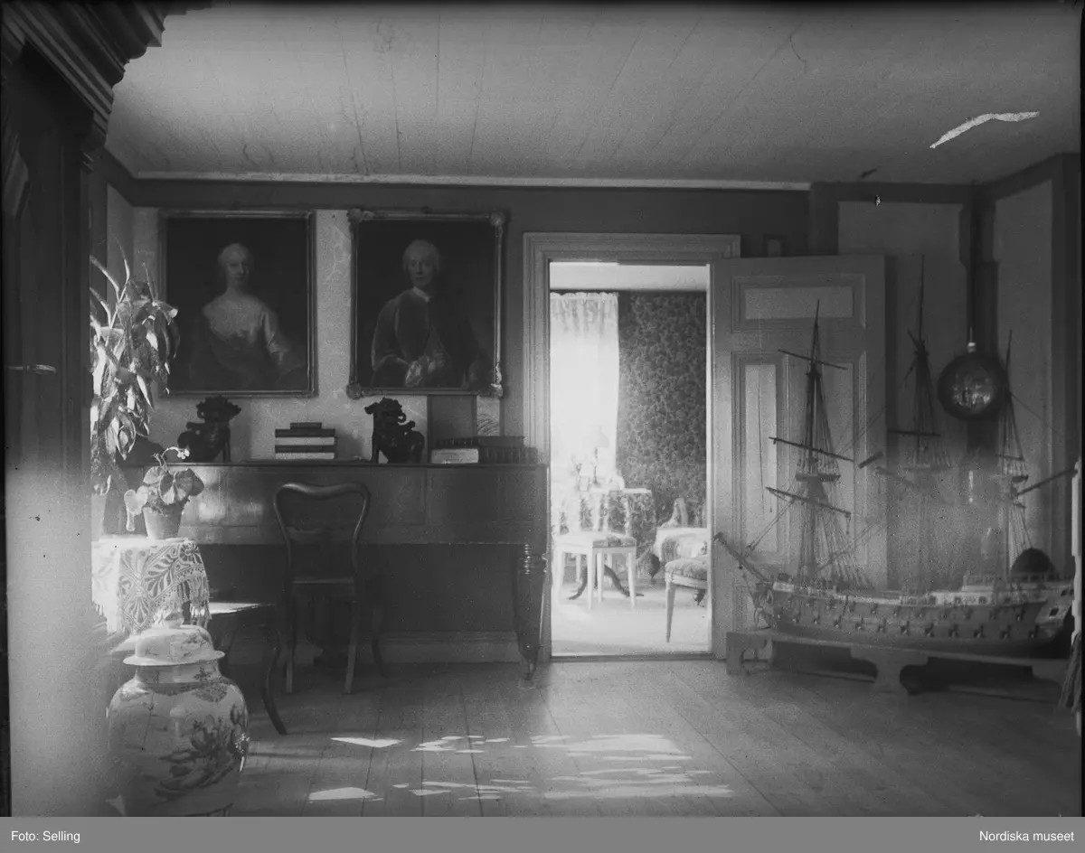 Matts Holmers (Mathias Gustaf Person Holmers) errgård på Lidö på Arholma, Vätö socken. Interiörbild av övre hallen med modellen till skeppet "Lovisa Ulrica" samt flera av kapten Holmers kinesiska föremål.
