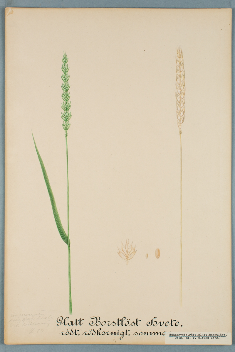 Sveriges kulturväxter. Illustration utförd av Henriette Sjöberg. Vete, sommarvete, rött, glatt, borstlöst, rödkornigt. Odlat Ultuna 1872. Inv. nr. C101 : 93.