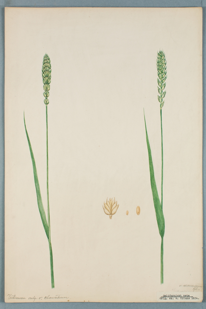 Sveriges kulturväxter. Illustration utförd av Henriette Sjöberg. Vete, Californiskt. Odlat Ultuna 1874. Inv. nr. C101 : 30.