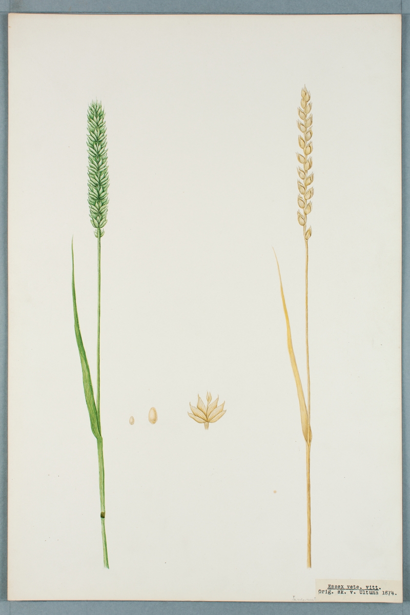 Sveriges kulturväxter. Illustration utförd av Henriette Sjöberg. Vete, Essex vitt. Odlat Ultuna 1874. Inv. nr. C101 : 37.