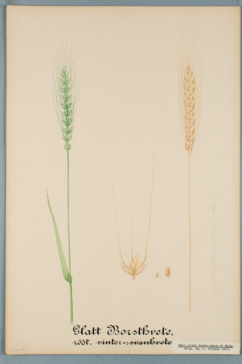 Sveriges kulturväxter. Illustration utförd av Henriette Sjöberg. Vete, rött, glatt borstvete från Elde. Odlat Ultuna 1875. Inv. nr. C101 : 81.