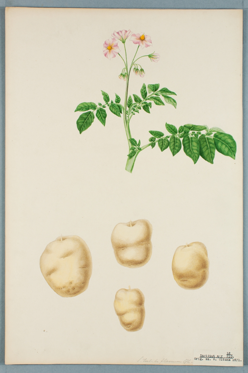 Sveriges kulturväxter. Illustration utförd av Henriette Sjöberg. Potatis, vitgul, Institut, nr. 18/210. Odlad Ultuna 1871. Inv. nr. C101 : 309.