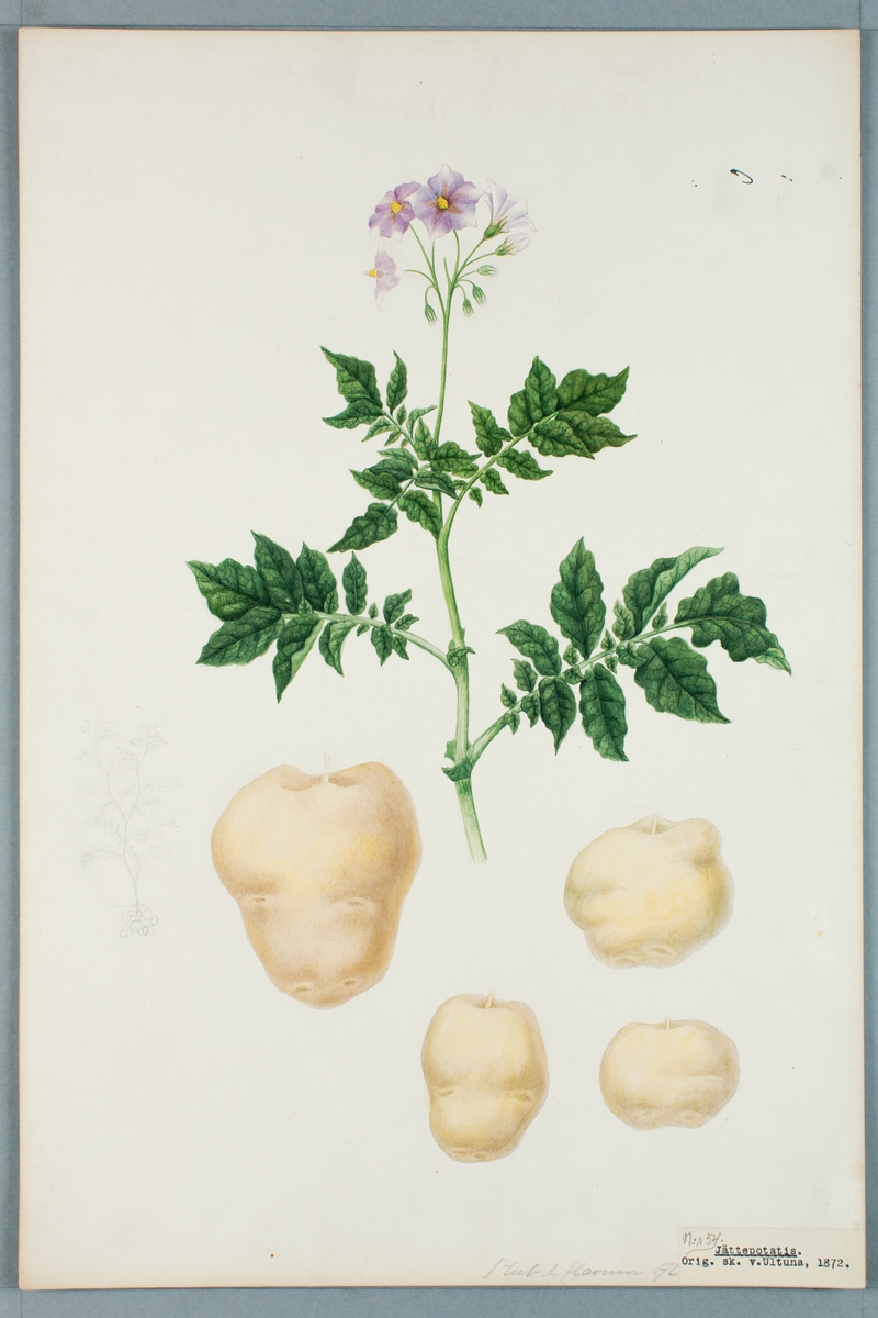 Sveriges kulturväxter. Illustration utförd av Henriette Sjöberg. Potatis, vitgul, avlång, Jättepotatis, nr. 54. Odlad Ultuna 1872. Inv. nr. C101 : 312.