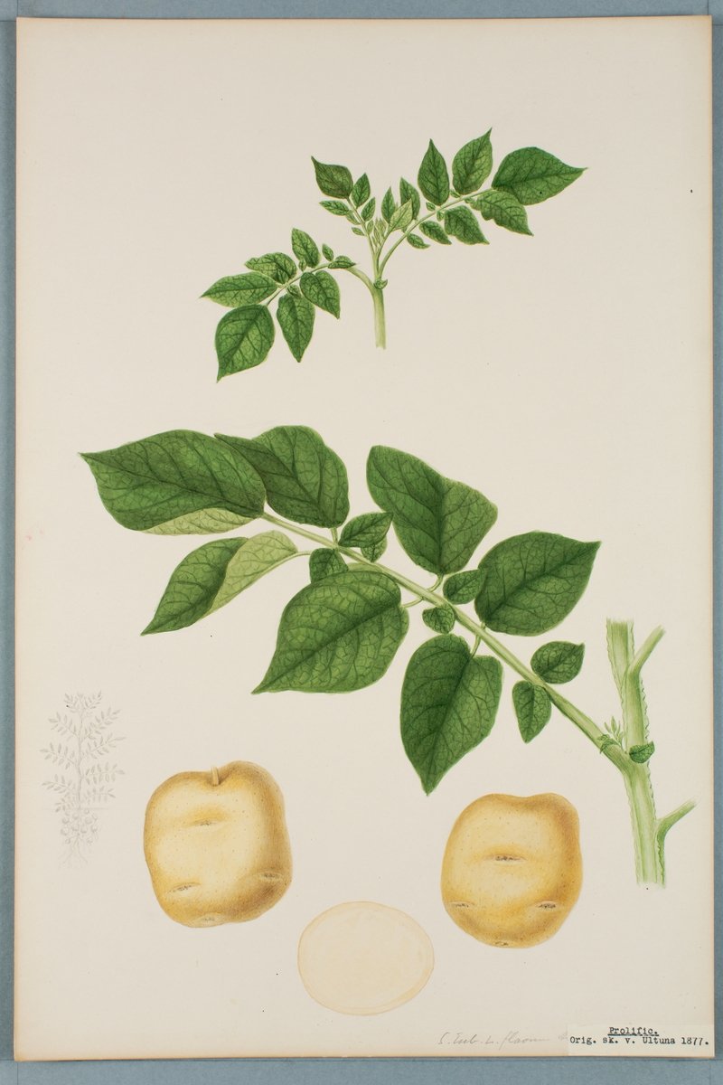 Sveriges kulturväxter. Illustration utförd av Henriette Sjöberg. Potatis, vitgul, Prolific. Odlad Ultuna 1877. Inv. nr. C101 : 325.