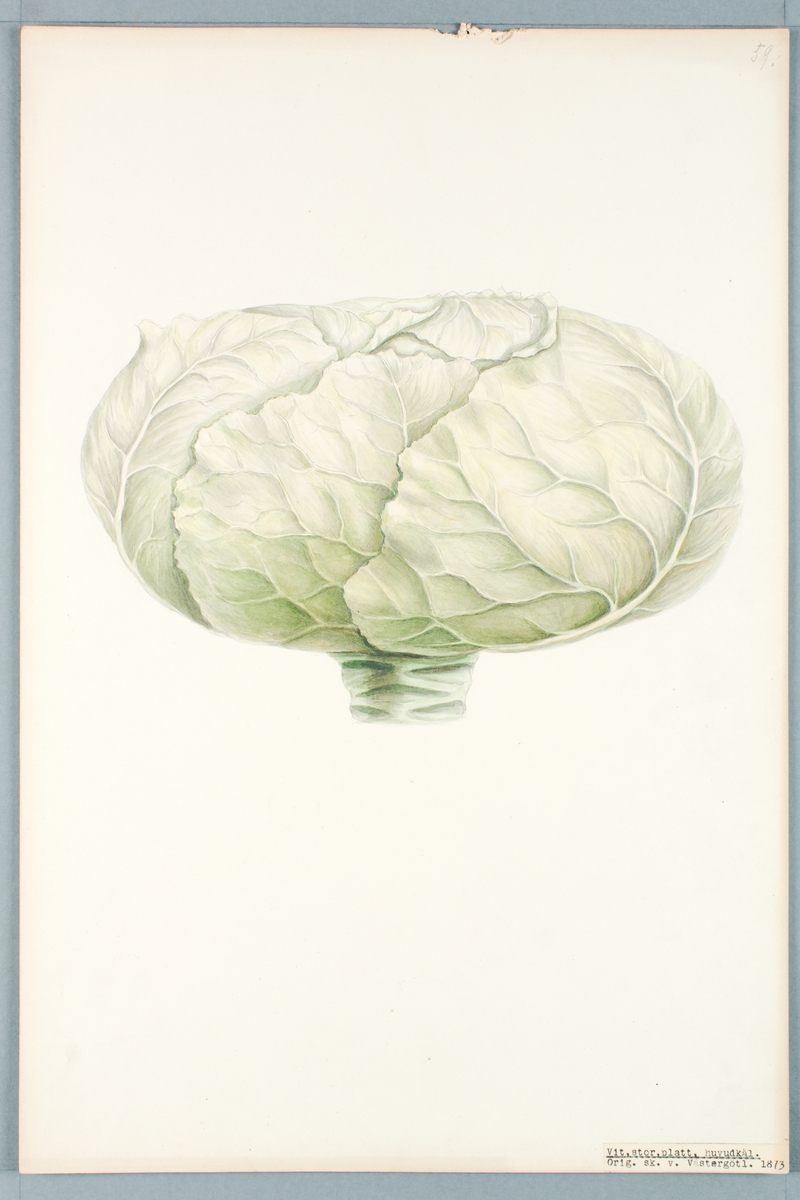 Sveriges kulturväxter. Illustration utförd av Henriette Sjöberg. Huvudkål, stor, vit, platt. Odlad Experimentalfältet 1873. Inv. nr. C101 : 356.