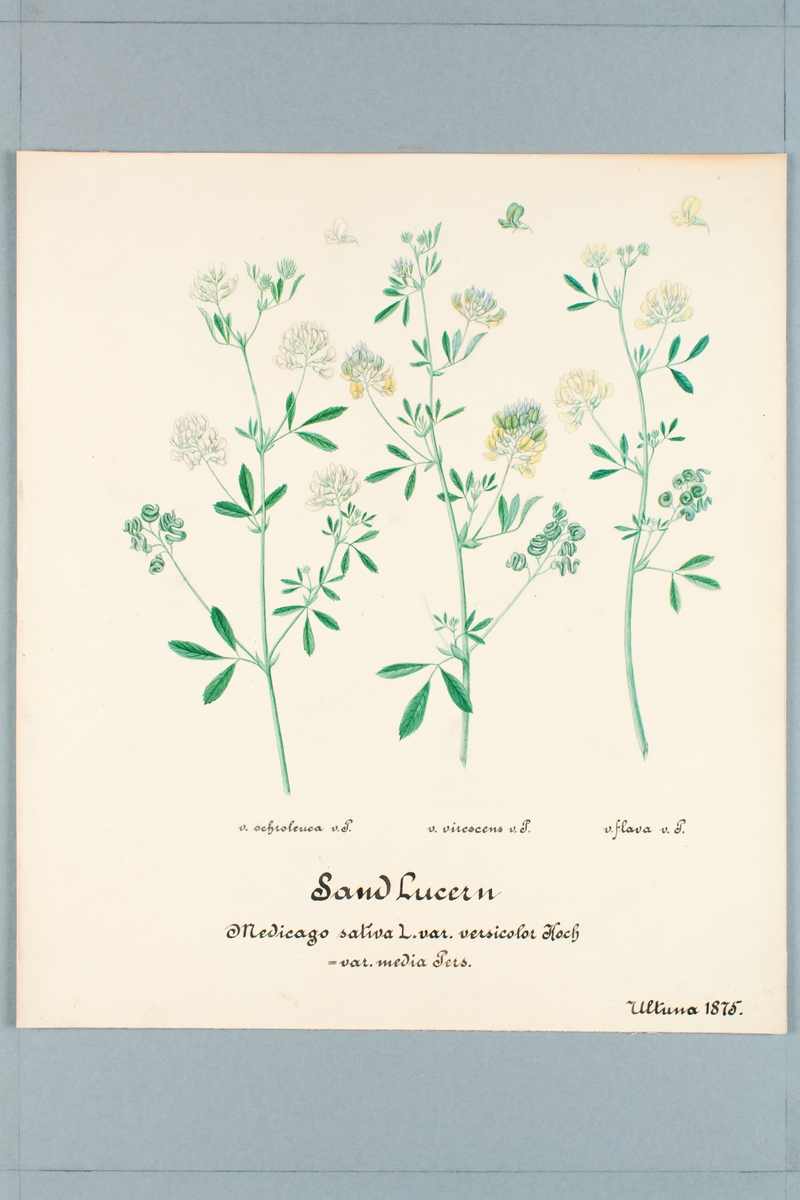 Sveriges kulturväxter. Illustration utförd av Henriette Sjöberg. Sandluzern (Sand Lucern påskrift), tre varieteter. Odlad Ultuna 1875. Jämför NMA.0098350.