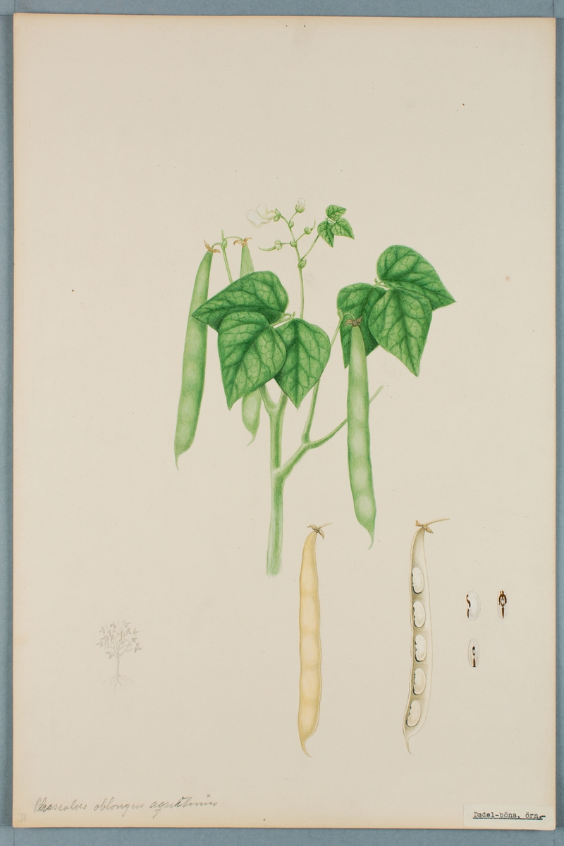 Sveriges kulturväxter. Illustration utförd av Henriette Sjöberg. Örndadelböna. Odlingsplats och datering saknas. Inv. nr. C101 : 457.
